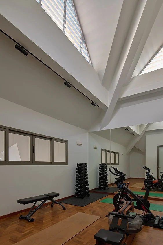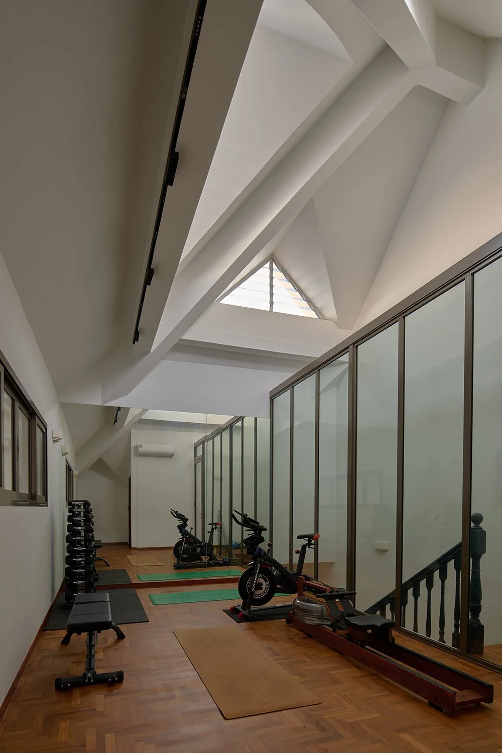 Meanwhile, the attic, which used to house a bedroom, was turned into a combined gym and yoga studio. New glazing replaced walls so the confined area doesn’t feel claustrophobic, while slit windows overlook the family area below and facilitate cross-ventilation.