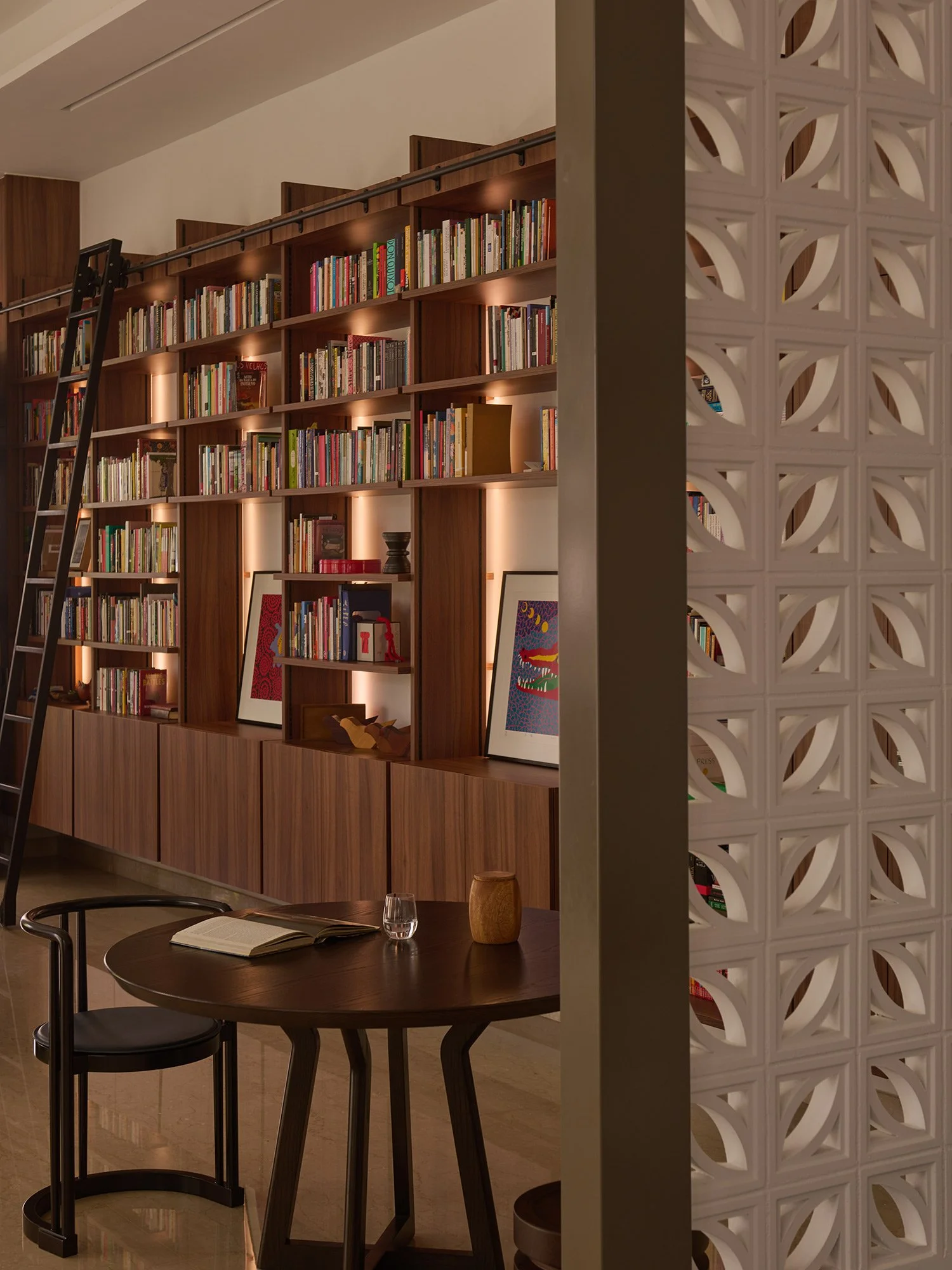 A striking feature of the home is a custom-built, double-volume bookshelf inspired by the Morgan Library & Museum in New York.