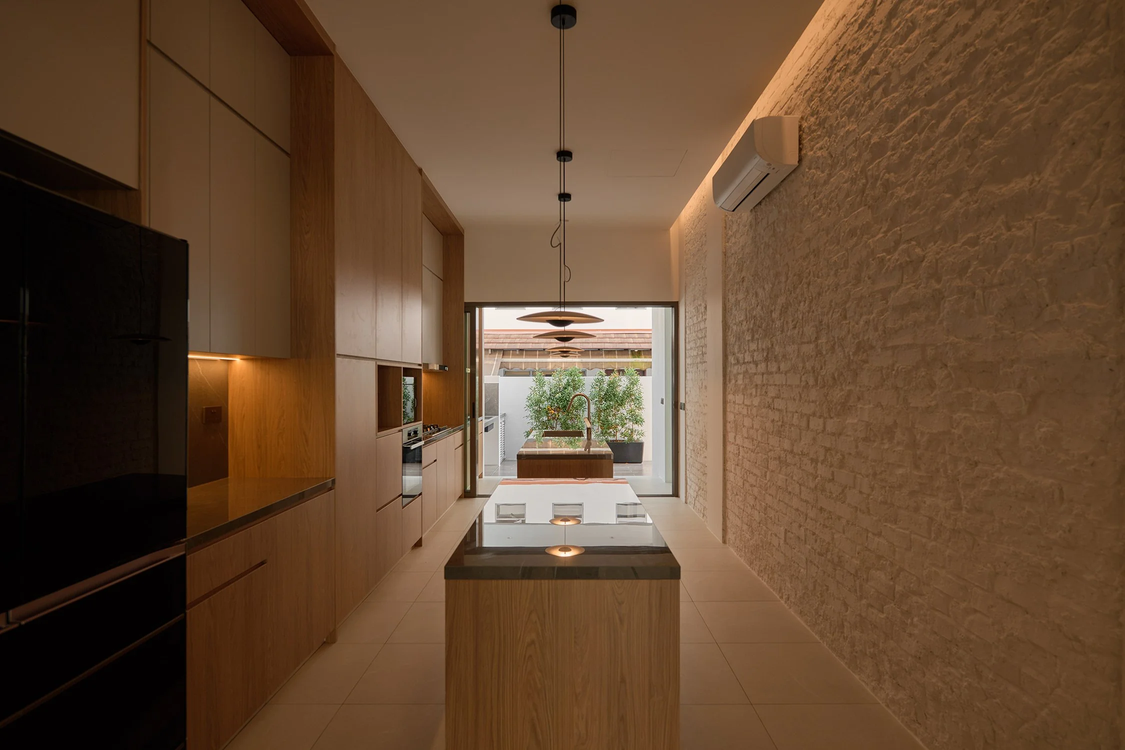 In the kitchen, the wall separating it from the yard was knocked down, resulting in an open plan layout integrating both dry and wet kitchen areas. The original plaster was also stripped from the walls to reveal exposed brickwork, giving the space a raw and intriguing edge.